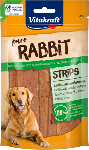 Is jouw hond ook zo'n vleesliefhebber? Verwen je bedelaar dan met de onweerstaanbare Pure Rabbit van Vitakraft®! Deze konijnenvleesreepjes bieden puur genieten dankzij hun 100% mager konijnenvlees, zonder toegevoegde suikers, soja, granen, eieren, zuivelproducten en vleesmeel. De snacks worden met zorg bereid zonder kunstmatige kleurstoffen, smaakversterkers en conserveringsmiddelen. Perfect voor een gezonde, soortspecifieke beloning die je hond niet kan weerstaan!