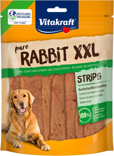 Begint jouw hond ook te kwijlen bij de geur van vlees? Verwen je viervoeter dan met de Pure Rabbit XXL van Vitakraft®! Deze grote konijnenreepjes laten jouw hond puur genieten, zonder toegevoegde suikers, kunstmatige kleurstoffen, smaakversterkers en conserveringsmiddelen. Het vleesaandeel bestaat uit 100% mager konijnenvlees, vrij van graan, soja, eieren, zuivelproducten en vleesmeel. De snacks zijn duurzaam verpakt in hersluitbare zakjes van recyclebaar materiaal, zodat je kunt genieten met een schoon geweten en zonder onnodig plastic. Puur vlees, puur plezier!