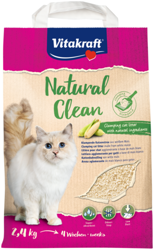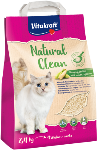 Natural Clean is gemaakt van maïs, wat zorgt voor kleine, lichtgekleurde korrels die uitstekend absorberend zijn. De korrels vormen direct stevige klonten bij contact met vocht, waardoor je de kattenbak eenvoudig schoon kunt houden.