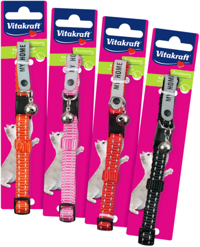 Met deze weerbestendige nylon Vitakraft® kattenhalsband kan jouw kat veilig op avontuur. Het handige adreslabel biedt de mogelijkheid om een telefoonnummer in te schrijven, zodat je maatje sneller teruggevonden wordt als hij verdwaalt. Dankzij het Snap & Easy veiligheidsslot schiet de halsband bij lage weerstand los, wat extra veiligheid biedt. Bovendien zorgen reflecterende strips ervoor dat je kat in het donker beter zichtbaar is voor automobilisten. De halsband is traploos verstelbaar (22-36 cm), heeft een subtiel belletje en is verkrijgbaar in verschillende kleuren.