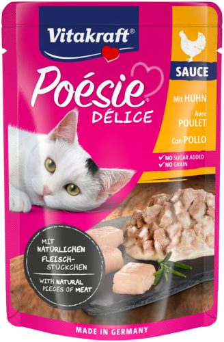 Laat jouw huistijger genieten van een verfijnde traktatie met Vitakraft® Poésie® Délice met kipfilet! Deze natvoeding bevat malse stukjes natuurlijke kipfilet in een fijne saus – een onweerstaanbare combinatie waar elke kat dol op is.