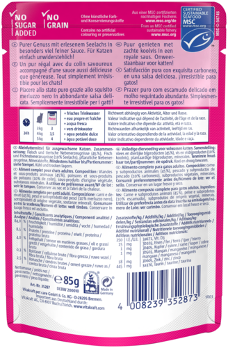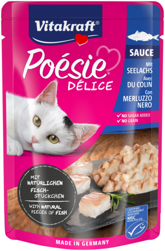 Is jouw kat een echte fijnproever? Dan zal ze zeker smullen van Vitakraft® Poésie® Délice met voortreffelijke koolvis in verfijnde saus! Deze natuurlijke, hoogwaardige visstukjes bieden een unieke smaakervaring die elke kat zal verrassen. Gemaakt van 100% duurzame koolvis uit MSC-gecertificeerde visserij, is deze natvoeding perfect afgestemd op de voedingsbehoeften van jouw kat.
