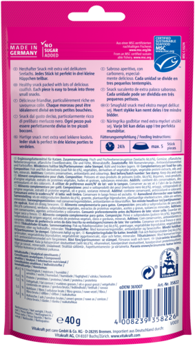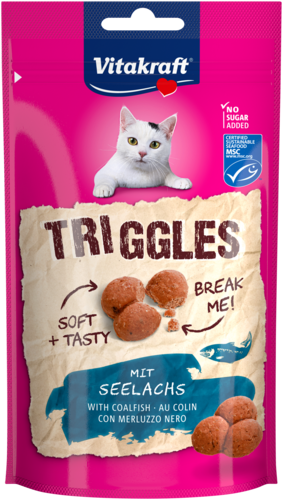 Op zoek naar een heerlijke vissnack voor je huistijger? Vitakraft® Triggles met ruim 60% fijne koolvis zijn zachte, hartige traktaties waar katten dol op zijn. Dankzij de unieke drievoudige vorm kunnen ze eenvoudig in kleinere stukjes worden gebroken voor extra verwenmomenten. Zorgvuldig in de oven bereid en zonder toegevoegde suikers. Of je ze nu in één stuk of meerdere stukjes geeft, jouw kat zal er gegarandeerd van smullen!