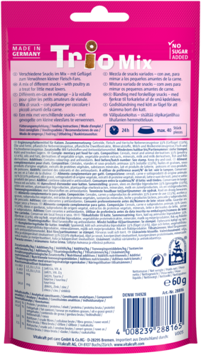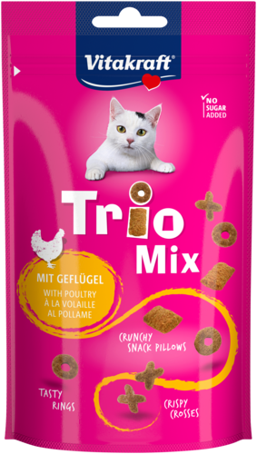 Op zoek naar een gevarieerde traktatie voor je huistijger? Vitakraft® Trio-Mix brengt afwisseling in het dagelijks snackplezier met een mix van knapperige ringetjes, kruisjes en onweerstaanbaar romig gevulde kussentjes. Verrijkt met essentiële vitamines, sporenelementen en taurine ter ondersteuning van ogen en hart. Een smakelijke en voedzame verrassing voor elke kat!