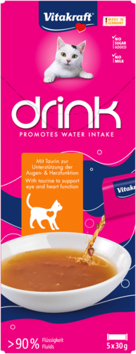 Is jouw kat een slechte drinker en heeft hij moeite met voldoende vochtinname? Geef zijn hydratatie een boost met de Vitakraft® Drink! Deze onweerstaanbare drinksnack in heerlijke kipsmaak zorgt ervoor dat jouw kat al spinnend van plezier drinkt. De speciale formule met taurine ondersteunt de gezondheid van het hart, netvlies en gezichtsvermogen van je kat.
