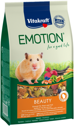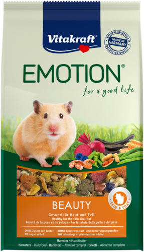 Rent jouw hamster enthousiast rond in zijn looprad of verstopt hij zich liever in zijn knusse nestje? Vitakraft® Emotion Beauty All Ages is de perfecte voeding voor iedere avontuurlijke hamster, met een uitgebalanceerde mix van waardevolle granen, gezonde groenten en knapperige noten. Speciaal samengesteld om niet alleen heerlijk te smaken, maar ook bij te dragen aan een gezonde huid en een glanzende vacht dankzij waardevolle oliën. Het recept bevat garnalen, een essentiële bron van dierlijke eiwitten voor een sterke en energieke hamster. Daarnaast ondersteunen de ruwe vezels en harde brokjes de natuurlijke tandslijtage, zodat het gebit van je kleine knager gezond blijft. Met de unieke Vitaliteitsformule, ontwikkeld door dierenartsen en knaagdierexperts, krijgt je hamster DHA uit zeealgen voor een sterk hart en een scherp brein, prebiotische inuline voor een gezonde darmflora en een optimale spijsvertering, en een uitgebalanceerde mix van essentiële aminozuren voor een sterk immuunsysteem. Zo krijgt je hamster alle belangrijke voedingsstoffen binnen die hij nodig heeft voor een actief en gezond leven vol plezier!