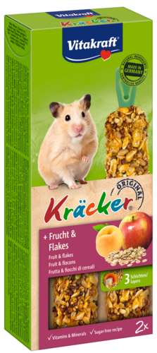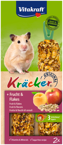 Is jouw hamster altijd druk in de weer en op zoek naar iets lekkers om te knabbelen? Trakteer hem dan op de Vitakraft® Kräcker met waardevolle granen en heerlijke vruchten! Deze drielaags gebakken knabbelsticks op een natuurlijk houtje zorgen voor extra lang knabbelplezier. Het smakelijke mengsel van granen, fruit en flakes is afgestemd op de voedingsbehoeften van je hamster en draagt bij aan een gezonde slijtage van zijn tanden. Bovendien zijn de Kräckers verrijkt met essentiële vitamines en volledig vrij van toegevoegde suikers. Een heerlijke en verantwoorde snack voor jouw kleine ontdekker!