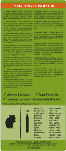 Is jouw hamster een echte knabbelkampioen? Trakteer hem dan op de Vitakraft® Kräcker! Deze heerlijke knabbelstaven met granen, honing en spelt zorgen niet alleen voor een smakelijke traktatie, maar ook voor actief knabbelplezier. Dankzij de drielaagse bakmethode blijven de ingrediënten stevig vastzitten, waardoor je hamster zich helemaal kan uitleven – net als in de natuur. Dit houdt hem lekker bezig én helpt zijn tanden op natuurlijke wijze afslijten. Bovendien zijn de Kräckers verrijkt met waardevolle vitamines en vrij van toegevoegde suikers. Een klassieker sinds 1965, speciaal afgestemd op de behoeften van jouw kleine knager!