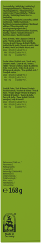 Samenstelling: Honing & spelt:, Granen* (spelt 1,6%), Plantaardige bijproducten, mineralen* 1,1%, zaden*, Honing* 0,32%, , fruit & Flakes:, Granen* (tarwevlokken 3,2%, havervlokken 7,2%), Plantaardige bijproducten, mineralen* 1,1%, zaden*, vruchten* 2%, Honing*, , druif & Noten:, Granen*, Noten* 11,6%, Plantaardige bijproducten, vruchten* (krenten 2%), mineralen* 1,1%, Honing*. *=Natuurlijke ingrediënten