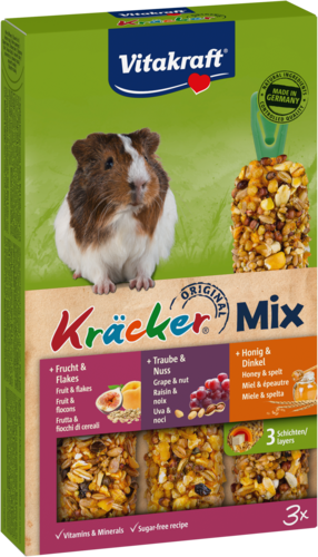 Verwen je cavia met de populaire Kräcker® Mix – een heerlijke variatie van drie smaken die je cavia gegarandeerd zal waarderen. Deze mix bevat drie verschillende varianten: Honing & Spelt, Druif & Noten, en Fruit & Vlokken. Wat een keuze!