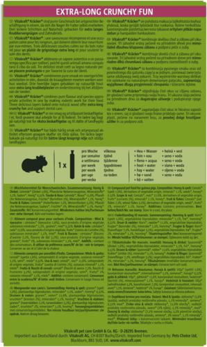 De Vitakraft® Kräcker® Mix is een verantwoorde lekkernij voor je cavia, verrijkt met essentiële vitamines en extra vitamine C. Bovendien worden de Kräckers bereid zonder toegevoegde suikers, zodat je cavia verantwoord kan genieten van zijn favoriete snack.