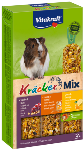 Verwen je cavia met de populaire Kräcker® Mix – de perfecte manier om variatie toe te voegen aan zijn dieet! Dit pakket bevat drie heerlijke smaken: Druif & Noten, Honing & Spelt en Citrus & Sinaasappel. Elke smaak biedt niet alleen pure verwennerij, maar ook een gezonde snack die je cavia actief houdt.