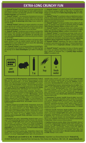 Onze Vitakraft®-kwaliteitsbelofte zorgt ervoor dat deze Kräckers speciaal op de voedingsbehoeften van cavia's zijn afgestemd. Ze bevatten essentiële vitamines, extra vitamine C en het Vital-Complex, dat helpt gebreksverschijnselen te voorkomen en zorgt voor extra vitaliteit. Bovendien zijn de Kräckers bereid zonder toegevoegde suikers, zodat je cavia verantwoord kan genieten van deze gezonde lekkernij.