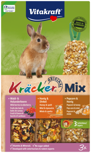 De drie-laagse, gebakken graanmengsels zijn stevig vastgezet op natuurlijk hout. Dat zorgt voor langdurig knabbelplezier en stimuleert het natuurlijke gedrag van je konijn. Dankzij het drievoudig bakproces in de Vitakraft®-bakkerij blijven de ingrediënten goed zitten en blijft de smaak behouden.