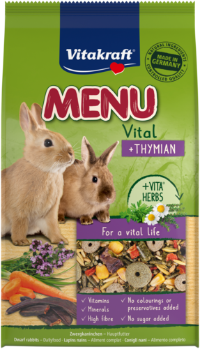 Menu Vital is optimaal afgestemd op de voedingsbehoeften van dwergkonijnen. Het voer bestaat uit hoogwaardige natuurlijke grondstoffen en is zichtbaar via het handige kijkvenster op de verpakking. Natuurlijk geproduceerd zonder toegevoegde suikers, kunstmatige smaakstoffen, kleurstoffen of conserveringsmiddelen.