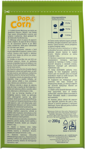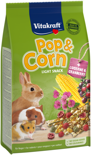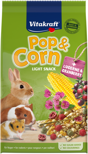 Wil jij jouw knaagdier verwennen met een vrolijke snack? De Vitakraft® Pop & Corn mix is een kleurrijke en lekkernij voor je huisdier, bestaande uit licht verteerbare popcorn-, tarwe- en speltpops, alfalfa en heerlijke cranberries. Het heeft een laag vetgehalte, is makkelijk te verteren en ideaal om uit de hand te voeren. Deze snack is geschikt voor alle knaagdieren en konijnen en is bereid zonder toegevoegde suikers, kunstmatige kleurstoffen, smaakversterkers en conserveringsmiddelen. Dankzij de Aroma Fresh verpakking blijft de popcorn lekker knapperig. Perfect voor een verwenmoment!