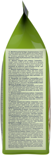 Samenstelling: Mais, voorverstijfseld* 30%, Tarwe, voorverstijfseld* 19%, maïsvlokken*, spelt, voorverstijfseld* 10%, Tarwemeel*, luzerne* 7%, maïsmeel*, luzerneconcentraat* 1,5%, cranberry, gedroogd* 1%, Rode biet concentraat*, rijstmeel, gefermeenderde*, calciumcarbonaat*. *=Natuurlijke ingrediënten