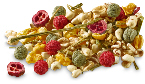 - Mix van verschillende delicatessen (verteerbare popcorn, tarwe- en speltpops, smakelijke luzerne en heerlijke veenbessen)