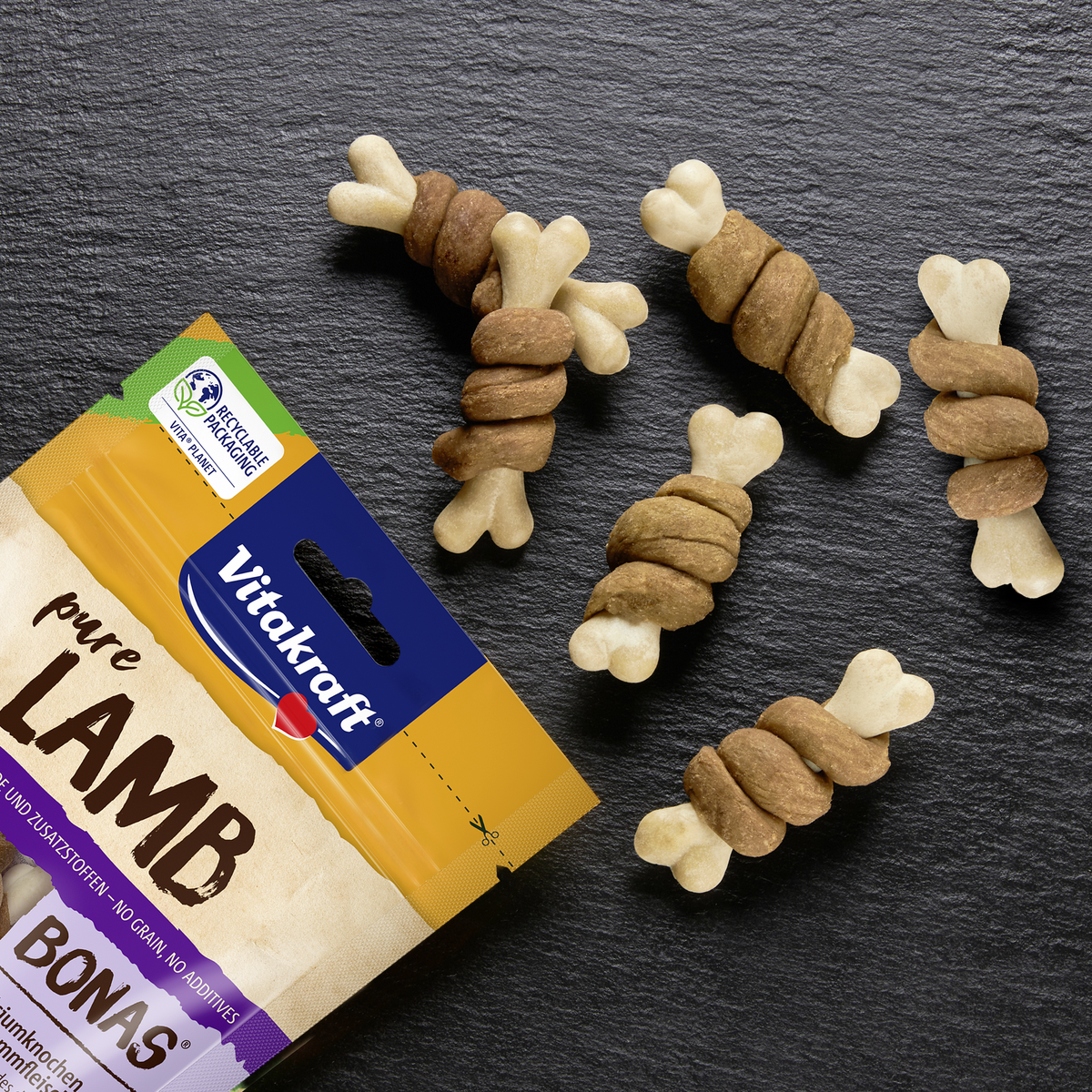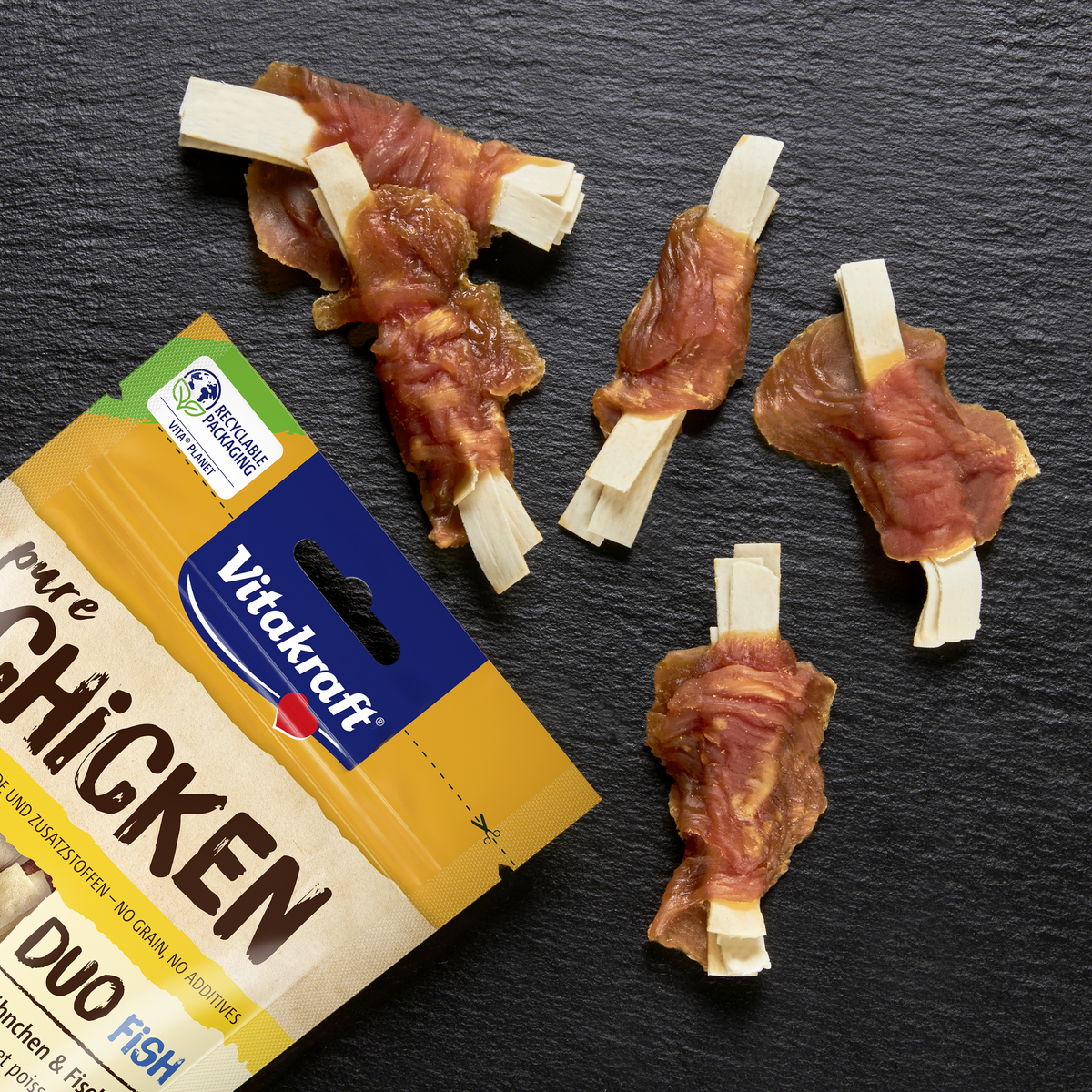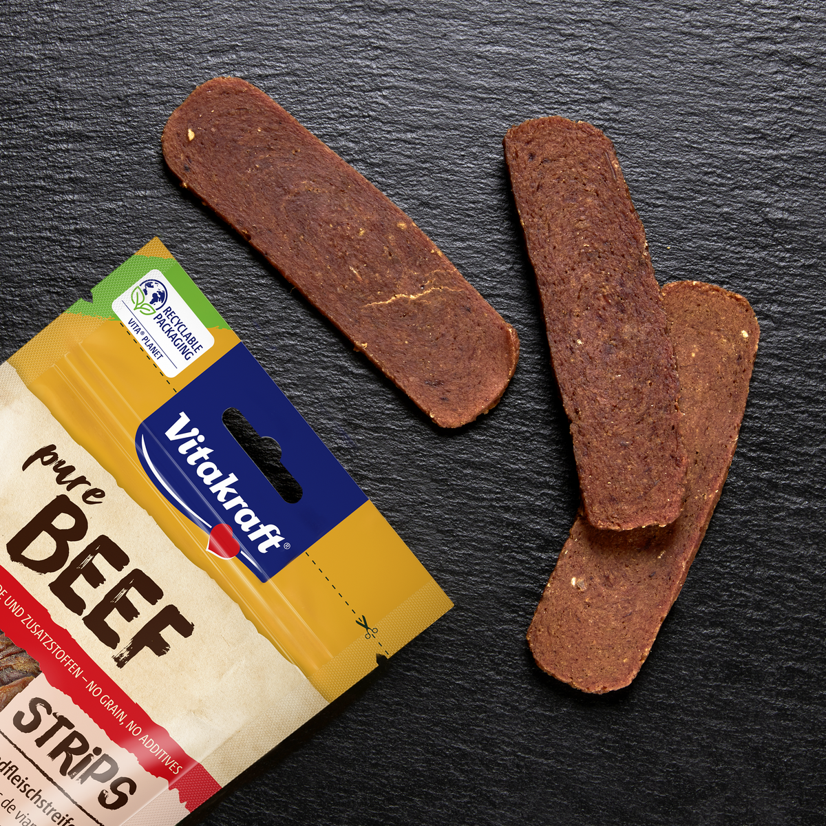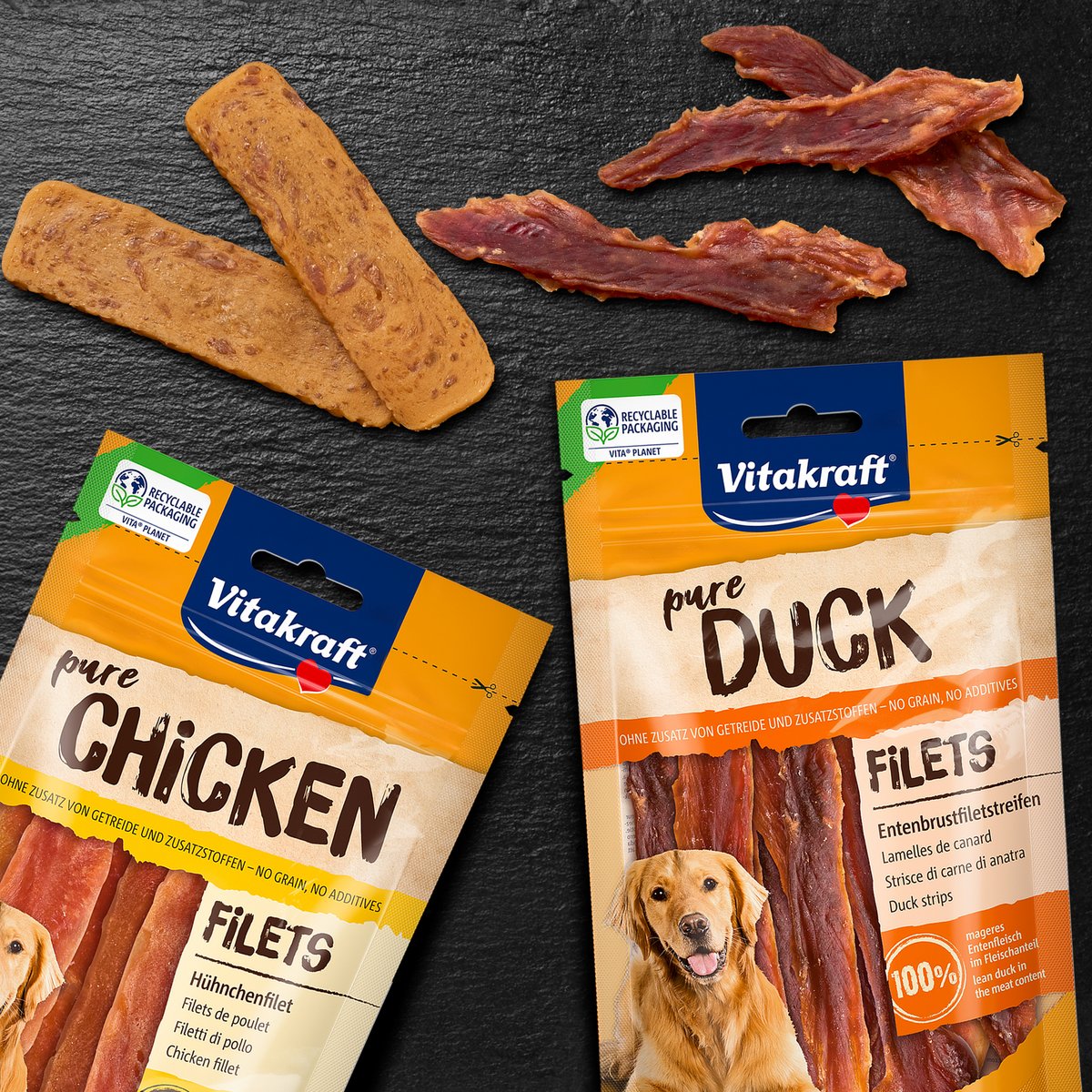 Nuestros Pure snacks de Vitakraft® están elaborados con ingredientes naturales, sin azúcares añadidos, cereales, soja, trigo, huevo ni harinas a base de carne. Sin colorantes ni potenciadores artificiales del sabor.