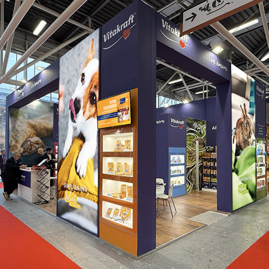 Vitakraft ha accolto i visitatori in uno stand di 50 m², organizzato per famiglie animali e focalizzato su best seller e novità di prodotto, con spazi dedicati anche ad accessori, comfort e display.