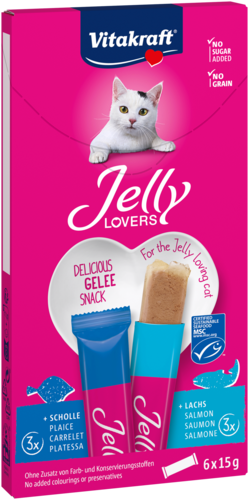 Jelly Lovers is graanvrij en bevat geen toegevoegde suikers, kleurstoffen en conserveermiddelen. Daarnaast helpt de gelei het vochtgehalte van je kat op peil te houden, ideaal voor katten die weinig drinken.