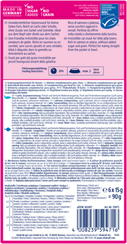 Samenstelling: Met zalm: Vlees en dierlijke bijproducten, Vis en visbijproducten (14% zalm), mineralen, Met schol: Vlees en dierlijke bijproducten, Vis en visbijproducten (14% schol), mineralen.
