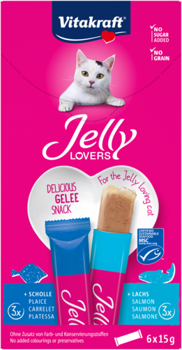 Staat jouw kat alweer te loeren naar jouw gerookte zalm? Geen zorgen, met Vitakraft® Jelly Lovers krijgt hij zijn eigen culinaire verwennerij! Deze sappige gelei-snack met schol en zalm is puur genieten en perfect voor kleine fijnproevers.