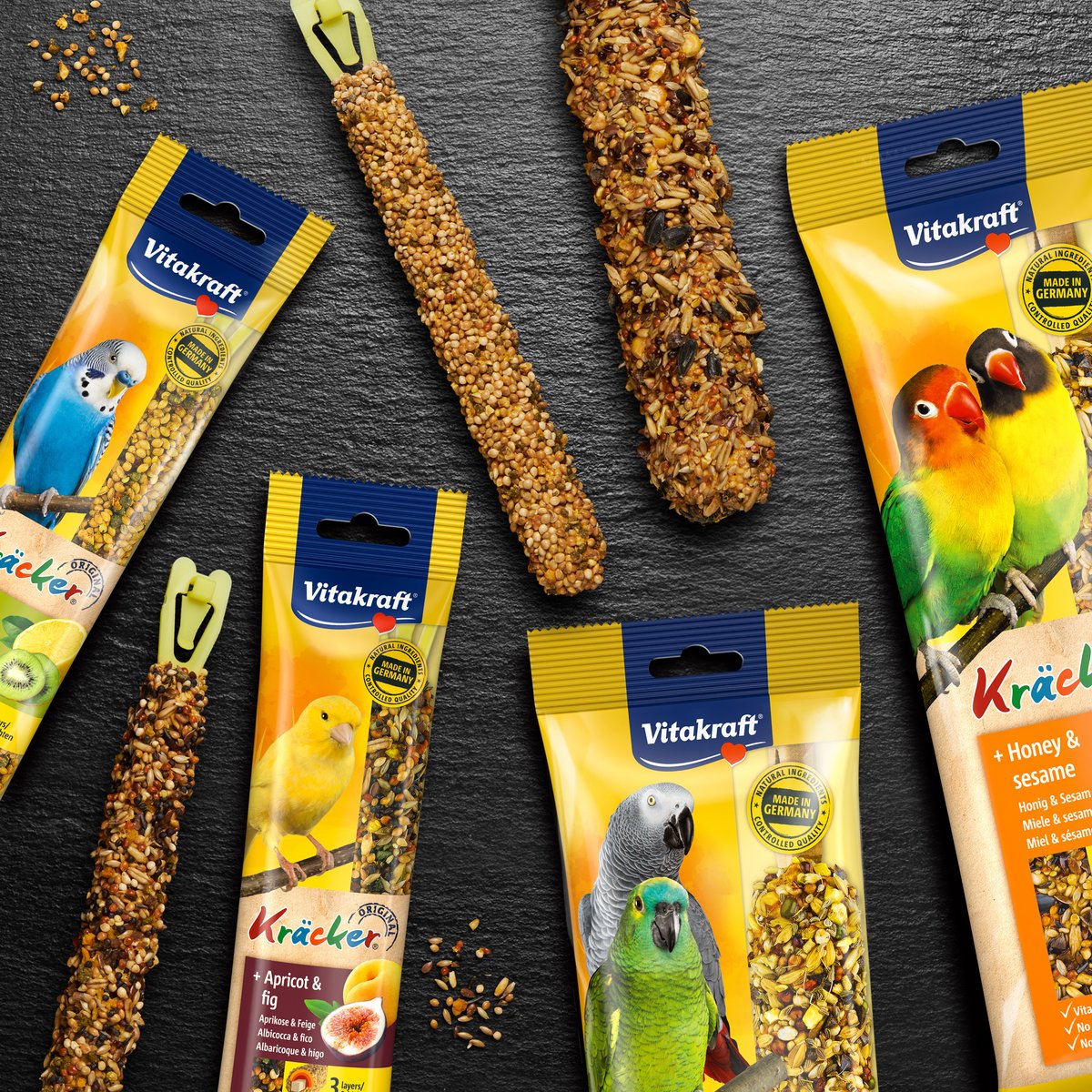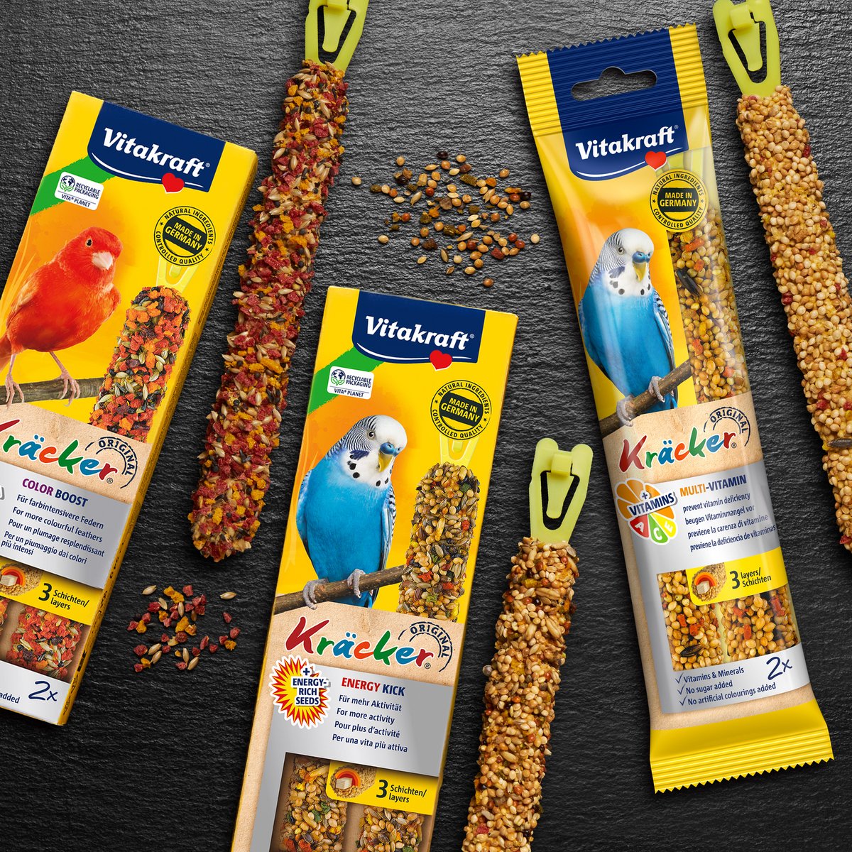 As Original Vitakraft® Kräcker® são aquecidas em três tampas sobre madeira natural.
